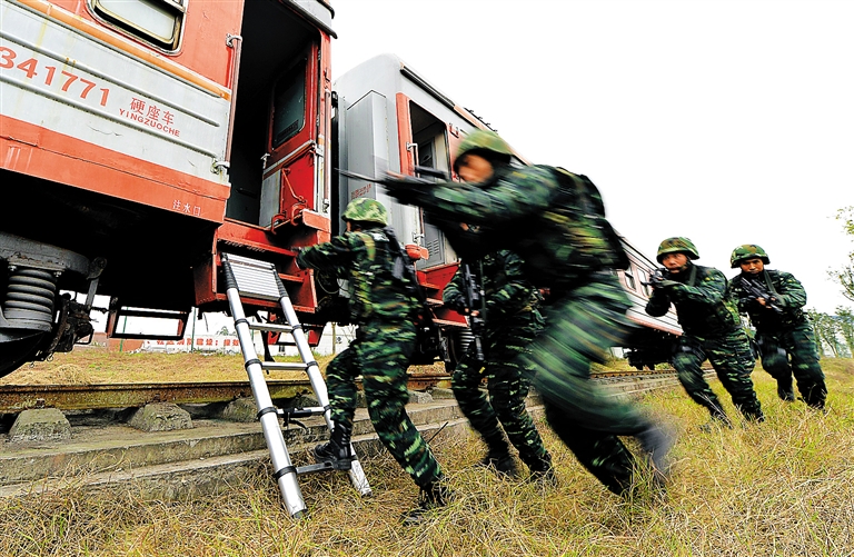 1月20日,武警重庆总队七支队特战队员在演练中快速出击。 当日,常年担负重庆市春运安保执勤的武警重庆总队七支队以实战环境为背景开展火车反劫持实兵实装对抗演练,内容包括现场封控、旅客疏散、隐蔽侦察、营救人质等,确保部队遇有危急情况时能够迅速出动,高效处置。