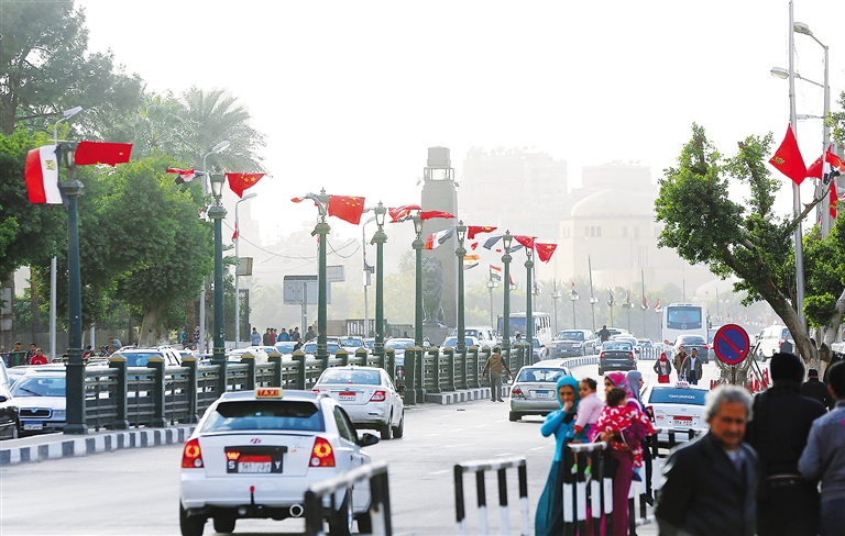 为迎接中国国家主席习近平访问埃及,开罗主要街道悬挂上了中埃两国国旗。 新华社发