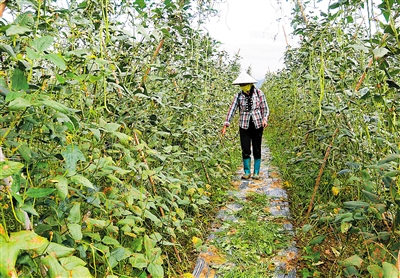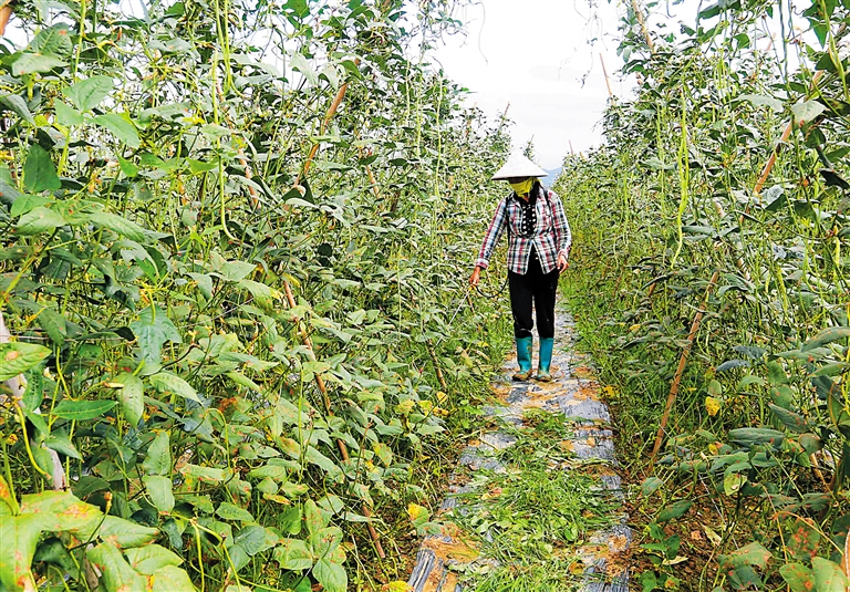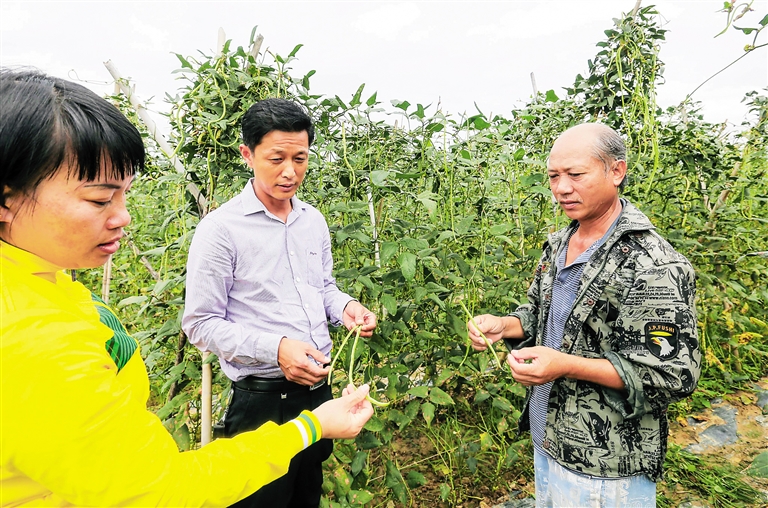 韦振义口中的“及时雨”,说的是前段时间,他发现自家种的豇豆叶子发卷,心里着急却又无计可施。乐东县扶贫办了解情况后,立即联系专家到韦振义的田里帮忙指导,解决问题。