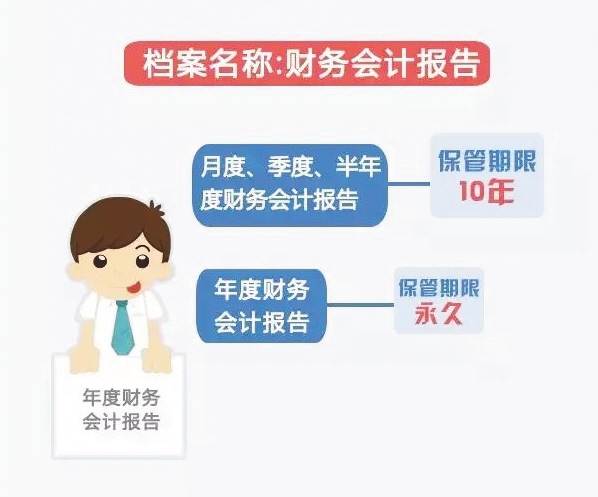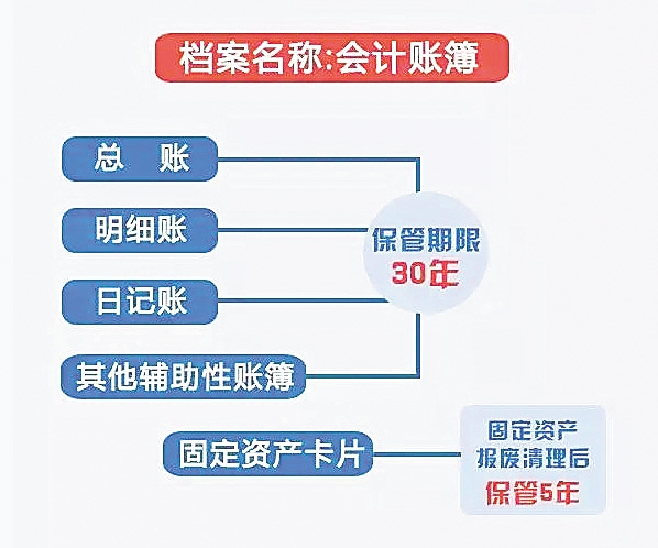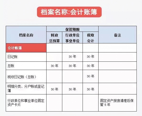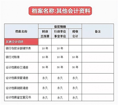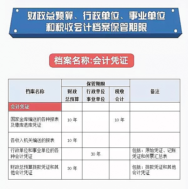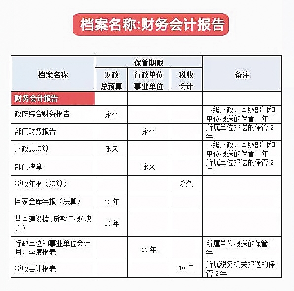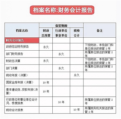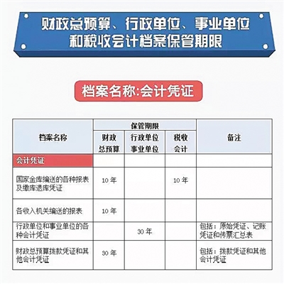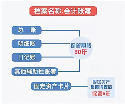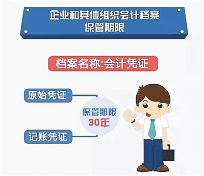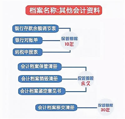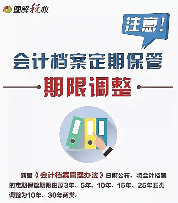 新版《会计档案管理办法》已从2016年1月1日起开始施行了。《办法》明确会计档案的保管期限分为永久、定期两类。定期保管期限由原来的3年、5年、10年、15年、25年调整为10年、30年两类。其中,保管期限为3年、5年、10年的会计档案统一规定保管期限为10年;保管期限为15年、25年的会计档案统一规定保管期限为30年。详见下图:
