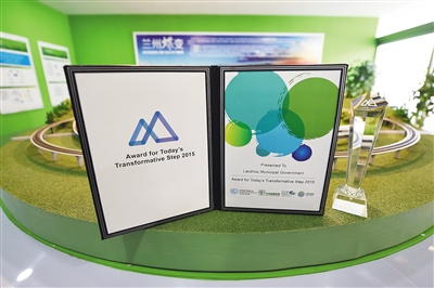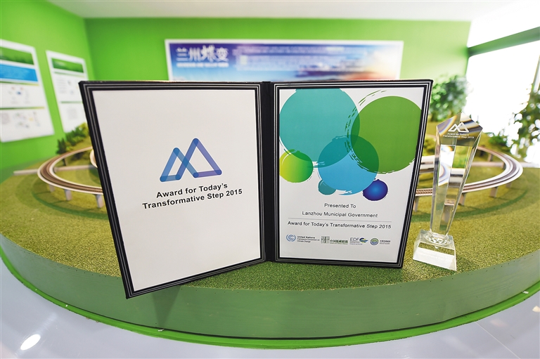 这是在兰州环境能源交易中心拍摄的兰州市在巴黎气候变化大会上获得的“今日变革进步奖”证书和奖杯(1月6日摄)。 党的十八大首提“美丽中国”、将生态文明纳入“五位一体”总体布局以来,“给子孙留下天蓝、地绿、水净的美好家园,赢得永续发展的美好未来”,成为治国理政的时代新要求。 老工业基地,老大难问题,污染曾经成为兰州人的“心肺之患”,年年治理,不见好转。 谈起治霾,中央有要求,群众有呼声。但关键是“治污必须要用决心、行动和效果说话”,“再大的困难、再大的矛盾、再大的投入,都是应该的、值得的。” 甘肃省委书记王三运说。 时光转到2015年末,兰州在巴黎气候变化大会上获得“今日变革进步奖”。“兰州蓝”成为这个曾经在卫星上“消失”的城市的常态。 新华社发