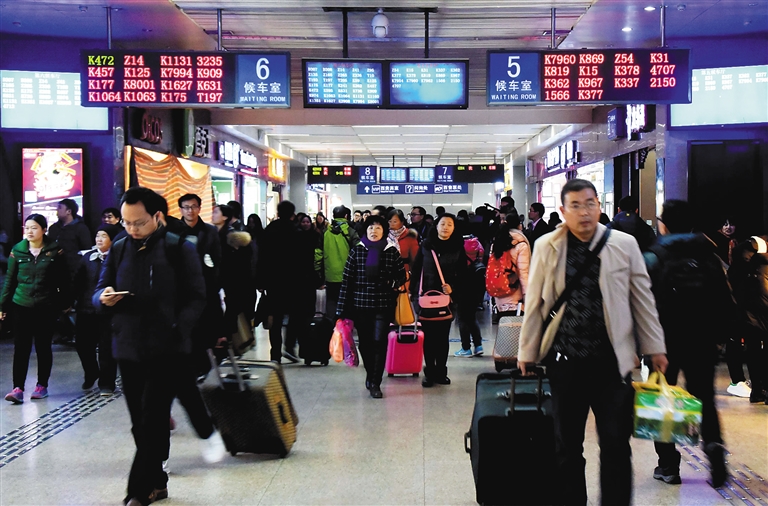 1月21日,旅客在郑州火车站进站候车。 当日,交通运输部举行例行新闻发布会。新闻发言人刘鹏飞和运输服务司副司长王水平在发布会上介绍,2016年春运预计全国旅客发送量将达到29.1亿人次,同比增长3.6%,其中铁路3.32亿人次,道路24.81亿人次,水运4280万人次,民航5455万人次。新华社记者 邢广利 摄