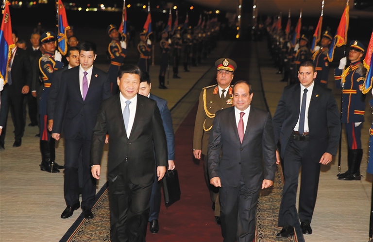 习近平指出,中埃两国是真朋友、好兄弟。2014年,中埃建立全面战略伙伴关系,把两国关系推到了新高度。我这次访问埃及,就是要全方位巩固和深化中埃关系,推动两国务实合作取得新成果。当前,中埃关系面临前所未有的机遇和广阔前景。中埃双方要加强发展战略对接,在共建“一带一路”框架内加快合作步伐,早日将共识化为实际成果。中方鼓励并支持有资质的企业参与埃及大项目建设,愿同埃方加强基础设施建设合作,持续推进产能合作。今年是中埃建交60周年,双方将互办文化年。双方要促进青年交流,鼓励更多游客到对方国家旅游,深化人文交流合作。中埃两国在许多重大国际问题上立场相近,在当前国际形势深刻变化的背景下,双方要加强在国际事务的沟通协调。