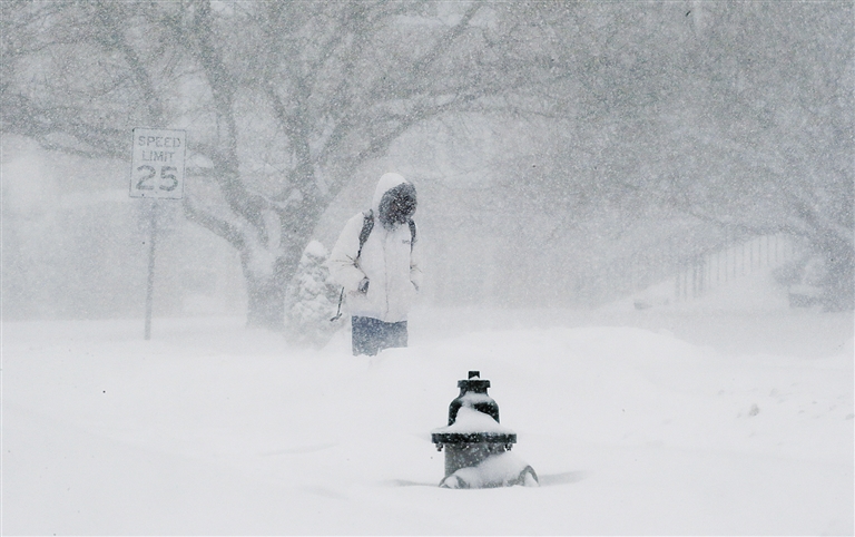 1月23日,在美国马里兰州塔科马帕克,一名行人在暴风雪中行走。 强暴风雪“乔纳斯”当天继续席卷美国东北部大部分地区,造成至少19人死亡,人口最稠密的纽约和华盛顿两个国际大都市沦为“鬼城”,街上路人稀稀落落,道路被封,机场停飞,公交停运,连百老汇都停演了。 新华社/路透