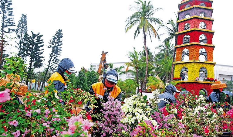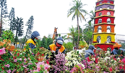 1月23日,首届国际旅游岛三角梅花展临近,在海南(海口)青少年活动中心,工人在摆放三角梅,进行三角梅花展最后的布展工作。