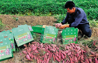 一位农民正在田间将收获的妹仔薯装箱准备出售。