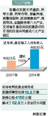 省深化海南农垦管理体制改革领导小组办公室主任周公卒说,海南农垦是我国最大的天然橡胶基地和热带作物生产基地。目前海南农垦除了橡胶以外,槟榔、胡椒、芒果等具有独特优势的产业,仍处于经营散、规模小、产业链短的状态。实施“八八”战略(即重点发展天然橡胶、热带水果、热带作物、草畜养殖、南繁育制种、旅游健康地产、商贸物流、金融服务等八大产业,支持省农垦投资控股集团依托农场和市县共同建设八大产业园区),这是省委、省政府针对农垦产业不大的实际,发挥农垦拥有土地资源和组织化的优势,以市场为导向、以资本为纽带、以农场为基地,打造一批核心竞争力强的骨干龙头企业和富有聚集效应的农业加工产业园区。