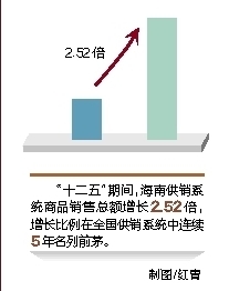 利润增长5倍,所有者权益增长42倍,商品销售额增幅连续5年在全国供销系统名列前茅。“十二五”期间,海南供销系统实现跨越式发展,成为全省服务“三农”主力军,是海南建设国际旅游岛的一大亮点。中华全国供销总社给予高度评价,省委、省政府给予充分肯定。