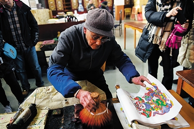 1月24日,朱仙镇木版年画传承人郭太运在河南开封博物馆的工作室内制作年画。 1月22日至26日,由文化部认可、淘宝众筹联合“故宫淘宝”发起的非物质文化遗产众筹项目上线。众筹项目的年货作品由“故宫淘宝”提供设计方案,高密剪纸、朱仙镇木版年画、内联升老布鞋等非遗传承人手工制作。 新华社发