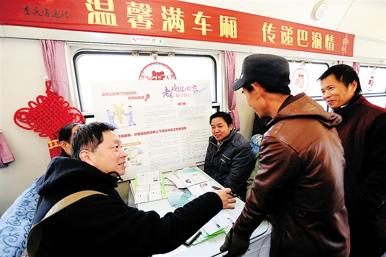 1月25日,返乡农民工在列车上讨论用工求职登记政策。 当日,在广州开往重庆的K4124次列车上,列车工作人员向返乡农民工发放涵盖重庆市针对农民工返乡创业的扶持政策、就业失业和用工求职登记政策、失业保险政策及职业培训政策等内容的宣传单。 据了解,这是重庆客运段与重庆市总工会联合开展的“幸福专列”活动的一部分,该活动将在重庆客运段春节前开行的9趟加开列车上举行。 新华社发