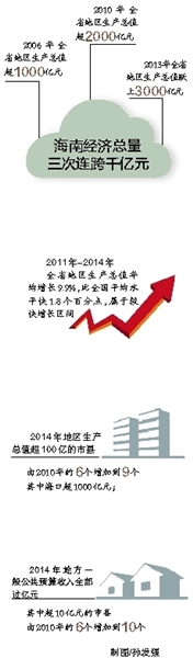“继2006年全省地区超1000亿元、2010年超2000亿元后,2013年全省地区生产总值(GDP)跃上3000亿元的台阶。海南经济总量用三次连跨千亿元的事实,表明海南综合经济实力进一步增强,经济增长的质量和效益又有了新的提升,发展后劲和活力进一步显现。”省统计局相关负责人说。