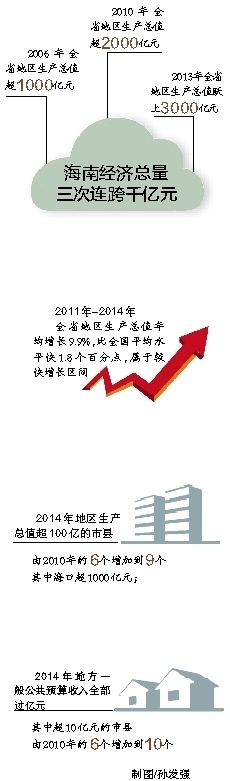 “五年间,西部地区平均发展速度为东中西部最高,成为带动海南发展的重要增长极。2014年地区生产总值超100亿元的市县由2010年的6个增加到9个,其中海口超1000亿元;地方一般公共预算收入全部过亿元,其中超10亿元的市县由2010年的6个增加到10个。”省发改委副主任朱华友说。