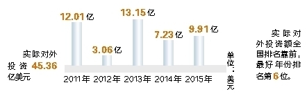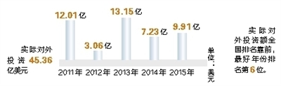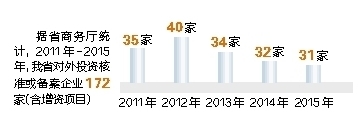 据省商务厅统计,2011年-2015年,我省对外投资核准或备案企业172家(含增资项目),历年分别为35家、40家、34家、32家、31家;实际对外投资45.36亿美元,分别为12.01亿美元、3.06亿美元、13.15亿美元、7.23亿美元、9.91亿美元;实际对外投资额全国排名靠前,最好年份排名第6位。