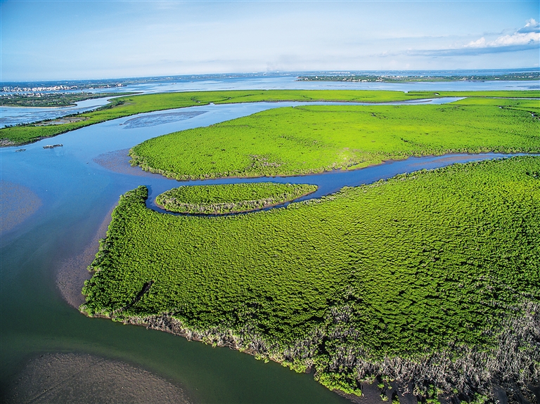 河道波光粼粼,葱茏的红树林随风荡漾,鹭鸟临泽理羽,鱼虾水底翔游,三三两两游人穿行在栈道上……文昌清澜港红树林自然保护区内一派人与自然和谐的景色,是对海南优良生态环境的最好诠释。