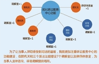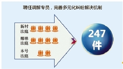 从员额法官中选任2名专职调解法官,在诉讼服务中心专门从事调解工作,5个多月时间里,共调解结案96件。在下辖三个派出法庭设置调解专员,10名调解专员目前成功调解结案247件。这两项举措,为完善诉调对接多元化纠纷解决机制探索出了一条可借鉴的新路子。