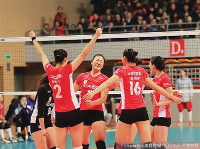 1月26日晚,2015-2016赛季全国女排联赛总决赛第4回合较量在江苏常州结束。主场作战的江苏中天钢铁鏖战五局后以3:2力挫天津渤海银行。此役获胜后江苏将总比分扳成2平,冠军归属的悬念将留到1月30日总决赛的决胜场破解。图为江苏队员庆祝胜利。小新发