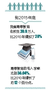 “十二五”期间,我省高等教育得到了长足的发展。到2015年底,我省高等教育在校生20.9万人,比2010年增加了28%,高等教育的毛入学率达到36.04%,比2010年增长了近12个百分点。高等教育经费投入不断增加,本科教育生均拨款从2011年1.2万元提高到1.8万元,高职教育的生均拨款从2011年0.8万元提高到1.2万元,后者的标准比国家的要求提早了两年。