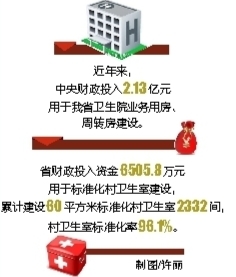 据了解,近年来,中央财政投入2.13亿元用于我省卫生院业务用房、周转房建设。省财政投入资金6505.8万元用于标准化村卫生室建设,累计建设60平方米标准化村卫生室2332间,村卫生室标准化率96.1%。中央、省财政投入2014万元用于村卫生室信息化建设,为2476所卫生室配备电脑、打印机,并开通网络宽带。省、市县财政投入2352万元为49个乡镇卫生院配置院前急救标准化救护车和车载设备。