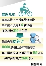 最近3年,我省投资2000多万元,在省内各市县修建了500多条全民健身路径。此外,我省已经在各市县实施了“雪炭工程”。这是国家体育总局贯彻《全民健身计划纲要》,为满足“老、少、边、穷”地区日益增长的体育健身需求,利用彩票公益金在全国范围内援建综合性公共体育设施的活动。最近几年,海南加快了自行车绿道建设。先后投入使用的6条绿道,道路总长250多公里。