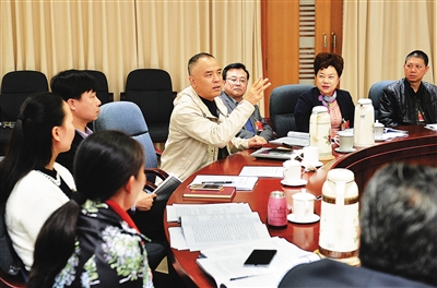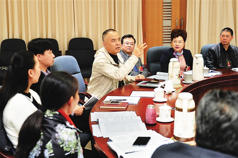 图为海口团代表景柱就我省加快发展新能源汽车发表意见。