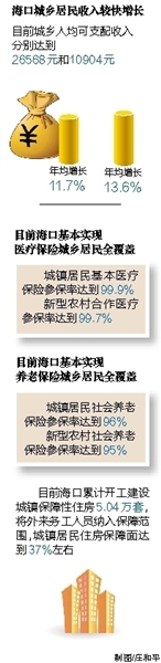 目前海口基本实现医疗保险城乡居民全覆盖,城镇居民基本医疗保险参保率达到99.9%,新型农村合作医疗参保率达到99.7%。基本实现养老保险城乡居民全覆盖,城镇居民社会养老保险参保率达到96%,新型农村社会养老保险参保率达到95%。累计开工建设城镇保障性住房5.04万套,将外来务工人员纳入保障范围,城镇居民住房保障面达到37%左右。扩大就业成效显著,城镇新增就业人员20.3万人,农村富余劳动力转移就业5.07万人。城乡居民收入较快增长,城乡人均可支配收入分别达到26568元和10904元,年均增长11.7%和13.6%。