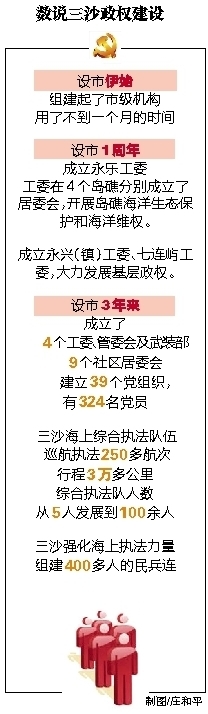 创新人口和户籍管理是三沙在完善政权建设中的探索之一。随着一项项政权工作的深入推进,三沙设市3年来也日益完善了其政权架构。在2012年设市挂牌后的1个月内,三沙市就完成了机构编制、人员岗位的详细设置和配备,先后设立了经济发展局、财税局、组织部、宣传部、国税局等市级党政部门。随着三沙群岛人民法院和三沙群岛检察院挂牌成立,三沙市两级法院、检察院组建工作正式完成,与此同时,三沙的人大工作也步入规范化运作,三沙市代表向省人大提交的相关建议得到重视和采纳。在基层政权建设方面,三沙逐步建立起了永乐群岛、七连屿、永兴镇、南沙等4个工委(管委会),成立了9个社区居民委员会。特别是在南沙成立了美济社区党支部,让鲜红旗帜在南沙群岛的岛礁上飘扬得更加热烈。