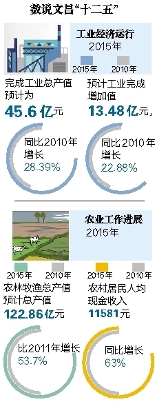 2015年,文昌市全市预计生产总值达175亿元,是2010年的1.46倍,年均增长7.8%;预计地方一般公共预算收入过13亿元,是2010年的2倍,年均增长14%以上;“十二五”期间,全市累计投资达720亿元,是“十一五”期间的3.1倍;城镇常住居民人均可支配收入26255元、农村常住居民人均可支配收入11455元,与2010年相比分别增长71%、87%。五年来,全市经济社会发展实现新跨越……一组组数据彰显出文昌“十二五”时期经济社会发展取得的显著成效,也展示出文昌“十三五”发展的良好基础。