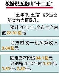 五年来,五指山综合经济实力大幅提升, 五年累计完成全社会固定资产投资131.8亿元,年均增长22%,这是五指山市投资规模最大、质量最好的时期。2015年全市生产总值22.01亿元、地方财政一般预算收入3.64亿元、固定资产投资34.1亿元,分别是2010年的1.31倍、1.81倍、2.22倍。产业结构得到优化,三大产业比重调整为24:21:55。