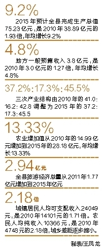 改善城乡环境,建设美丽乡村。城乡生活垃圾收集转运建设项目涵盖全县10个镇122个村(居)委会,866个自然村,惠及人口33万,五年来,共收集转运农村生活垃圾19万吨;加强园林绿化建设力度,全县建成区绿化面积从208.5公顷增加到278.35公顷,建成区绿地率从23.2%增加到30.9%,建成区绿化覆盖率从28.7%增加到36.06%……