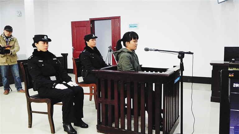 这是被告人杨某某在法庭审判现场(1月28日摄)。 当日,备受关注的利用“8·12”天津港爆炸事故在网上进行诈骗一案完成了一审判决,被告人杨某某(女)因犯诈骗罪,被广西防城港市防城区人民法院判处有期徒刑3年,并处罚金人民币8000元,作案工具手机1台予以没收。