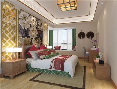 设计说明:主卧室以大荷叶的视觉画面与地幔木纹材质的砖铺成,室内装饰木质家具、窗棂、布艺床品相互辉映,布局格调高雅,造型简朴优美。以尊贵雅致的“现代中式”为主题、中式元素与现代材质的巧妙兼容,打造充满禅意的空间意境。