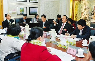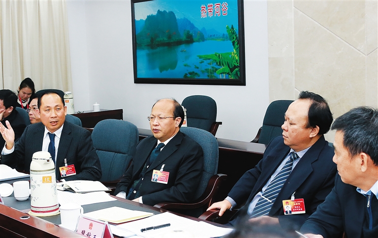 1月26日,参加海南省五届人大四次会议的代表们分组审议政府工作报告。图为毛超峰代表(前排右二)参加白沙代表团审议。 本报记者 王凯 摄