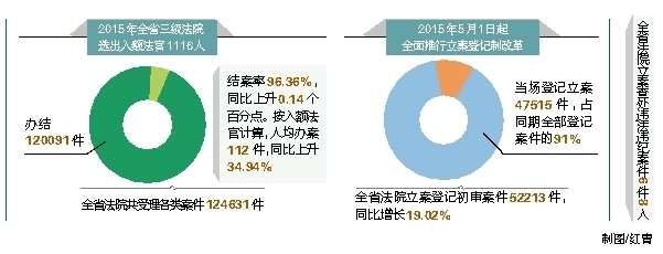 自去年3月以来,全省法院全面推行“谁审理谁裁判,谁裁判谁负责”的司法责任制,配套以立案登记制改革、涉诉信访改革、诚信诉讼制度推行,完成了四个方面44项改革任务,在法官员额减少28%、收案增加18%的情况下,全省三级法院忠实履行审判职能,各项工作取得了新进展。其中,在全国率先推出的案件“二维码”识别制度、防止同案不同判的类案参考制度、专业法官会议制度,得到最高人民法院积极肯定。