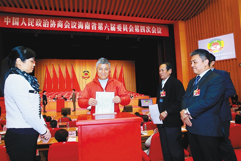1月29日下午,政协海南省六届四次会议在海南省人大会堂进行选举会议,增选副主席、常委。图为刘传刚委员在进行投票。