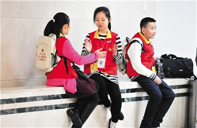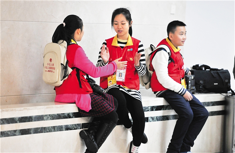 一次成长 1月29日,两位等待采访代表的小记者通过拍手游戏来调整状态、缓解疲劳,有机会采访这样的重要会议对她们来说,是一次难得的成长机会。本报记者 王凯 摄