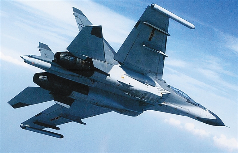 苏-27战斗机是前苏联苏霍伊设计局研制的单座双发全天候空中优势重型战斗机,是俄罗斯空军的主要战斗机。该机采用翼身融合体技术,悬壁式中单翼,翼根外有光滑弯曲前伸的边条翼,双垂尾正常式布局,楔型进气道位于翼身融合体的前下方,有很好的气动性能,进气道底部及侧壁有栅型辅助门,以防起落时吸入异物。