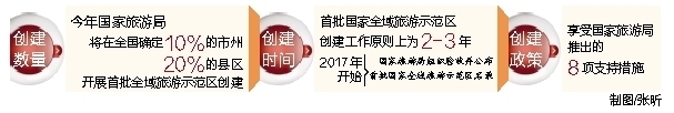经初步研究,今年国家旅游局将在全国确定10%的市州、20%的县区开展首批全域旅游示范区创建工作,确定海南省作为首个全域旅游创建省。据了解,首批国家全域旅游示范区创建工作原则上为2-3年。从明年开始,国家旅游局组织验收并公布首批国家全域旅游示范区名录。优先组织验收的创建单位需符合四项基本标准,一是旅游对当地经济和就业的综合贡献达到要求;二是建立了旅游综合管理和执法体系;三是厕所革命及公共服务建设成效明显;四是建成旅游数据中心。