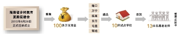 据了解,海南省乡村教育发展促进会2015年共委派志愿者支教老师13人,分赴海口东山中心小学、临高带笏希望小学、东方板桥镇本廉小学、屯昌东岭小学、万宁曲冲小学、万宁碌马中心学校、万宁立岭小学、万宁盐墩小学、万宁西坡小学、万宁琉川小学等10所学校支教。这些支教老师的引入,为乡村学校带去了新的活力,播撒爱的种子。