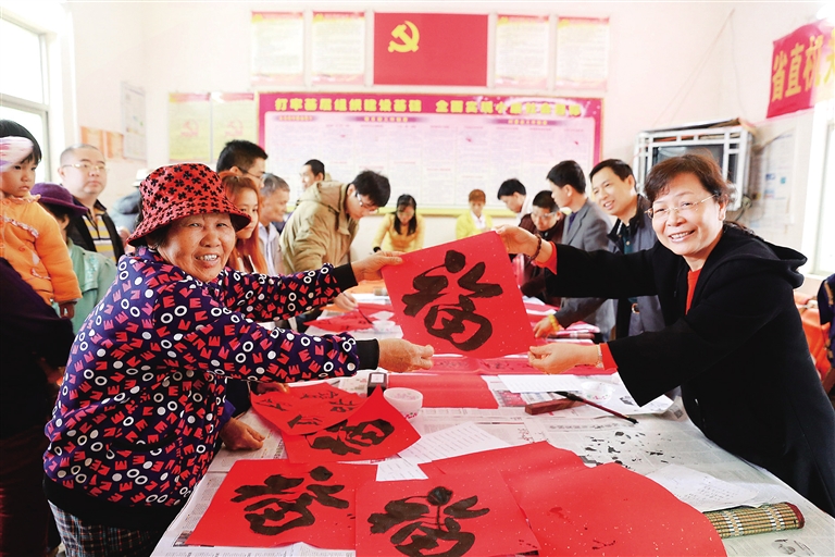 2月1日,2016年省直机关青年举行第二期新春关爱送温暖系列活动。当天,慰问团冒雨来到定安县龙门镇红花岭村,为村中困难家庭及村民送去年货等慰问品,青年书法家们现场为村民们写春联、献爱心,省直青年们在省直机关工委领导的带领下,走家串户为乡亲们送灯笼、送温暖,共迎新春。