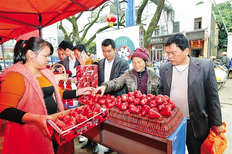 红彤彤的莲雾、水灵灵的圣女果、散发清香的番石榴,各类新鲜水果吸引了不少消费者的目光。“都是今天刚刚采摘的!如果还不放心,可以带你们去果园直接采年货!”摊主王德日带领一群来自广东的顾客去自家果园采摘年货。“以前办年货是腌肉熏鱼,来海南才发现鲜年货也很有意思。”游客周林吃力地抱着一大箱的番石榴与莲雾,打算带回家与家人分享。