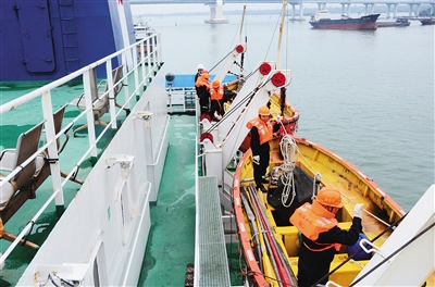 为保障2016年春运期间三沙陆岛交通补给安全顺利开展,1月27日,三沙海事局联合清澜海事局对停靠清澜港三沙专用码头的 “三沙1号”、“琼沙3号”开展春运船舶安全专项检查,并观摩指导了“三沙1号”和“琼沙3号”轮的消防弃船演习。图为“琼沙3号”轮船员正在释放救生艇。