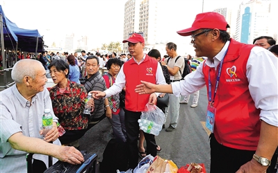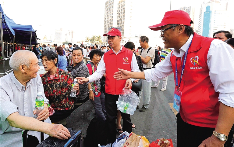 随着假期接近尾声,海南各地都出现旅客返程高峰。不少志愿者现身各大港口和车站,为返程旅客服务。图为几名志愿者正提醒旅客旅途注意安全。