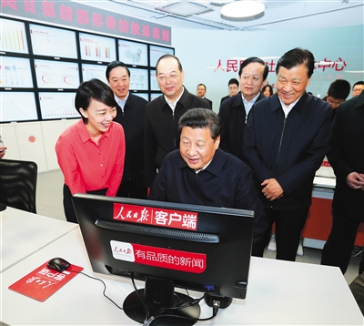 19日上午,习近平首先来到人民日报社调研。编辑楼内,一块块展板、一幅幅照片展示了党中央对人民日报的关怀,反映了人民日报社走过的不平凡历程。习近平一边观看,一边听汇报,他充分肯定人民日报创刊68年来为党和人民事业作出的重要贡献。在总编室夜班平台,习近平看编辑排版,同大家亲切交流,勉励他们不忘初衷、坚定信念,把报纸办得更好,为全国人民提供更多更好的精神食粮。习近平走进新媒体中心,在大屏幕前听取微博、微信、客户端工作介绍,并在一台电脑前坐下,通过新媒体平台发送语音信息,向全国人民致以元宵节的问候和祝福。