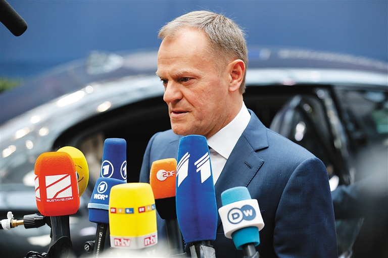 2月18日,在位于比利时首都布鲁塞尔的欧盟总部,欧洲理事会主席图斯克回答记者提问。 欧盟于2月18日至19日在布鲁塞尔召开春季峰会,期望同英国就欧盟改革方案达成共识,强化英国“留在”欧盟的意愿。此外,难民问题、利比亚和叙利亚局势等热点问题也在峰会议程内。新华社发