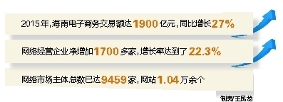 “海南网络市场前景广阔。”这是很多人的切身感受。但海南网络市场到底有多大呢?记者今天从海南省工商部门获悉,目前海南省网络市场主体总数已达9459家,网站1.04万余个。仅2015年一年,海南电子商务交易额达1900亿元,同比增长27%;个体工商户开办的网站数增长速度达到35.7%;网络经营企业去年净增加1700多家,增长率达到了22.3%,均创历史新高。