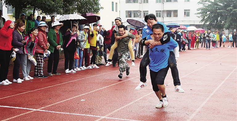 2月18日,在定安县第四届农民运动会上,队员们在进行比赛。据了解,本届农民运动会有背媳妇、抢收粮食、女子拔河等趣味竞赛项目,吸引了来自定安县10个镇代表团共300多名农民运动员参赛。