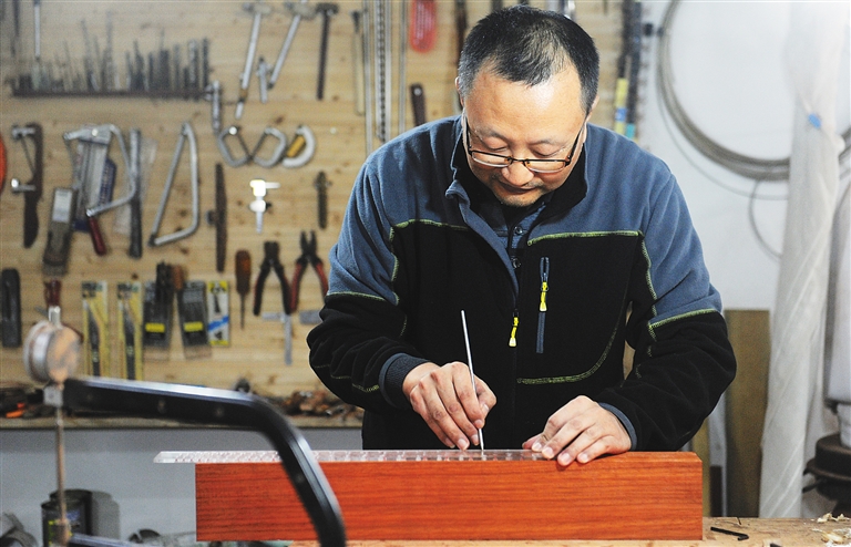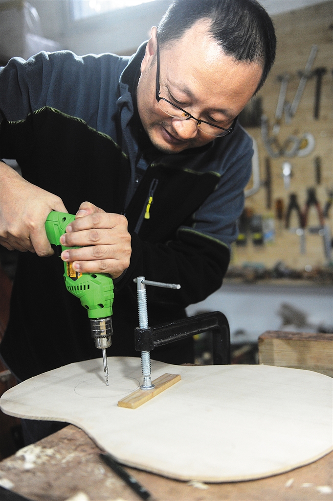 可是,琴虽好,手工制作的难度可不小,一把好的吉他要经过设计、选材、打磨、上漆、组装等多道工序,制琴的过程是枯燥乏味的,常常一做就是大半天,就单说一个钻孔,如何把握好位置、大小的精确度,都要耗费很多精力和时间,即使王安兆已经摸索了十余年,也时常无功而返。“现在我钻三个,能成功两个吧。”王安兆说,有句老话叫“慢工出细活”,手工制作的东西,一定要有足够的耐心。眼下,他还在琢磨打造一把旅游便携式的琴,可拆卸,可组装,好像折叠自行车一样,携带方便。