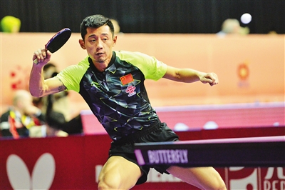 图为中国队选手张继科在比赛中,他以3:1战胜中华台北选手陈建安。 新华社发