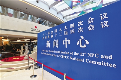 这是梅地亚中心内的两会新闻中心背景板(2月29日摄)。 当日,记者探访了设立于北京梅地亚中心的十二届全国人大四次会议和全国政协十二届四次会议新闻中心。据介绍,两会新闻中心于2月27日正式启用,目前各项工作准备就绪,静待中外记者的到来。 新华社记者 李鑫 摄