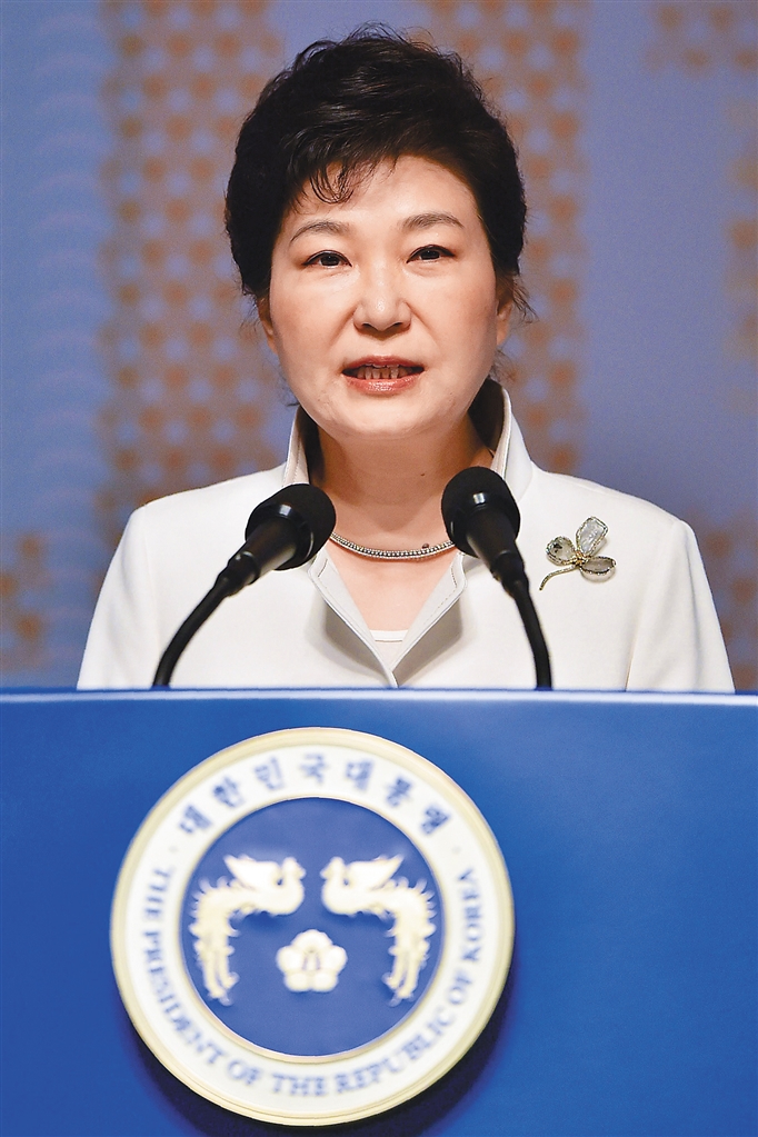 3月1日,韩国总统朴槿惠在首尔举行的“三一运动”97周年纪念大会上讲话。 韩国总统朴槿惠当日在“三一运动”97周年纪念大会上发表讲话,再次敦促朝鲜尽早弃核。 新华社/法新
